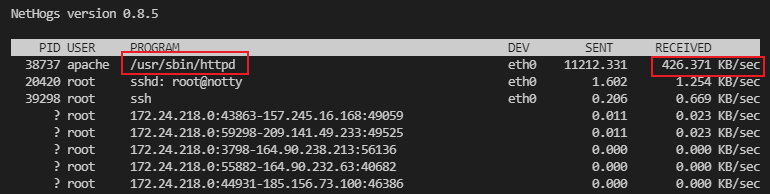 在nethogs监控界面,按s可以按照Sent列进行排序,按r可以按照Received列进行排序,按m可以切换不同的统计单位显示,例如kb/s、kb、b、mb。监控界面信息说明如下所示。